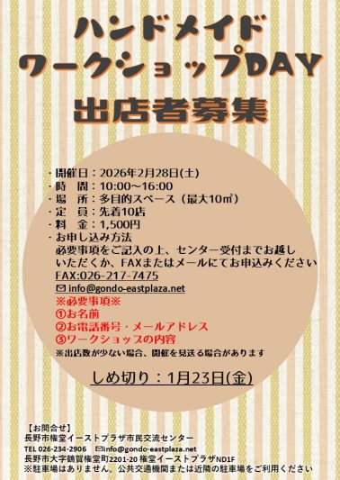 ハンドメイドワークショップDAY出店者募集!