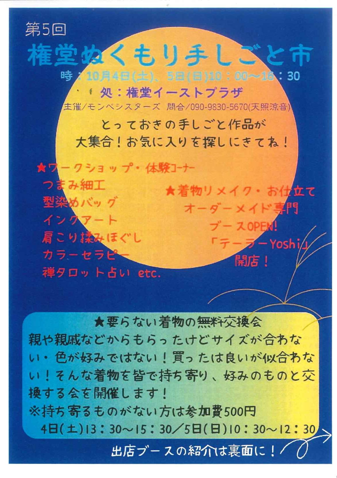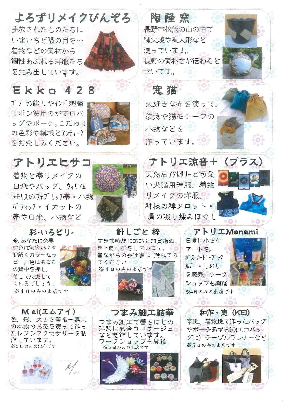 講座・イベント 第5回 権堂ぬくもり手仕事市 更新日:2025.07.01 日にち2025年10月04日(土)2025年10月05日(日) 時間10:00~16:00 場所コミュニティルーム1・2、多目的スペース