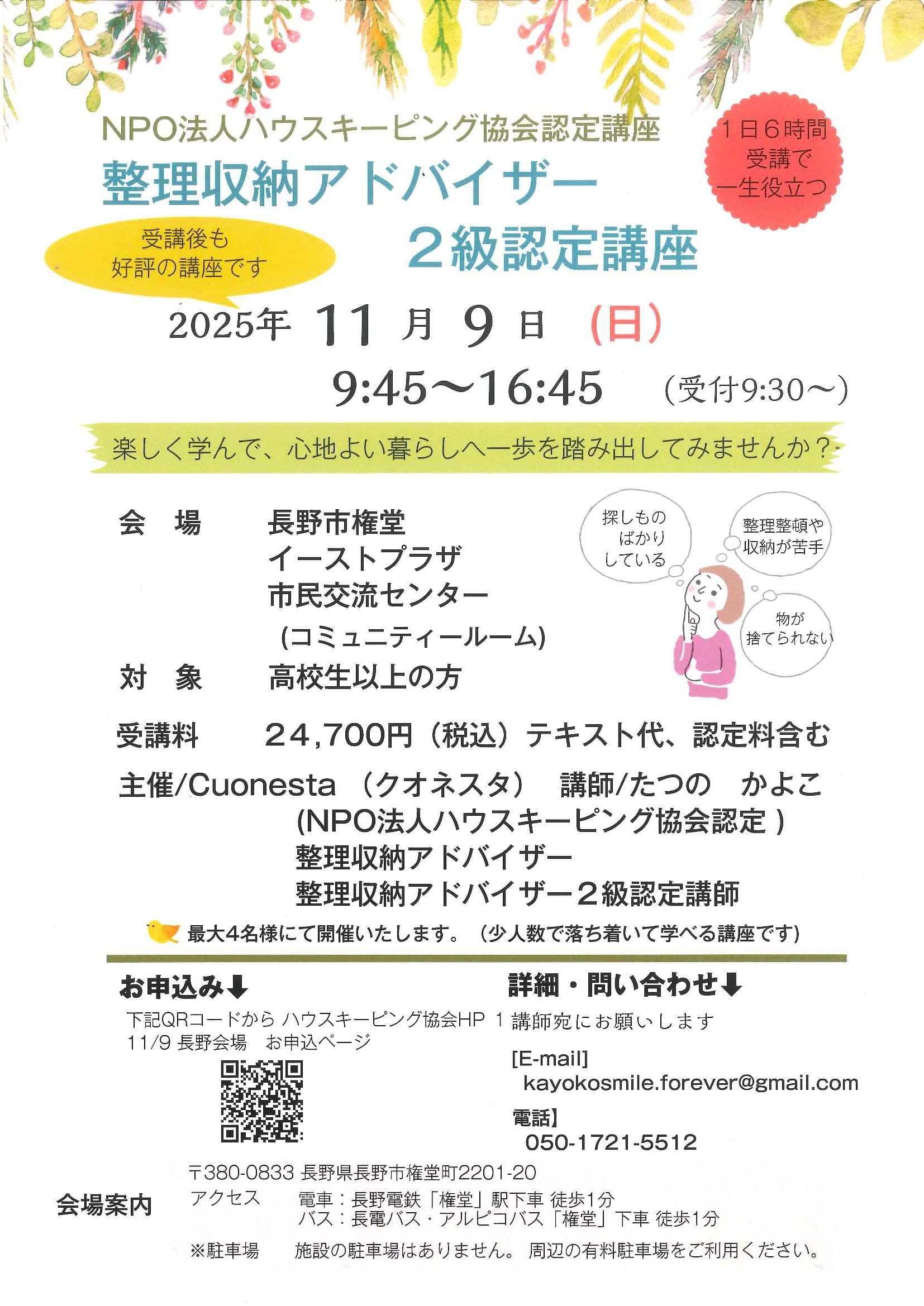 講座・イベント 整理収納アドバイザー2級認定講座 更新日:2025.08.22 日にち2025年11月09日(日) 時間9:45~16:45(受付9:30~) 場所コミュニティールーム2 参加費有料 予約方法詳細は主催者様へお問い合わせください。 内容お問合せ:050-1721-5512