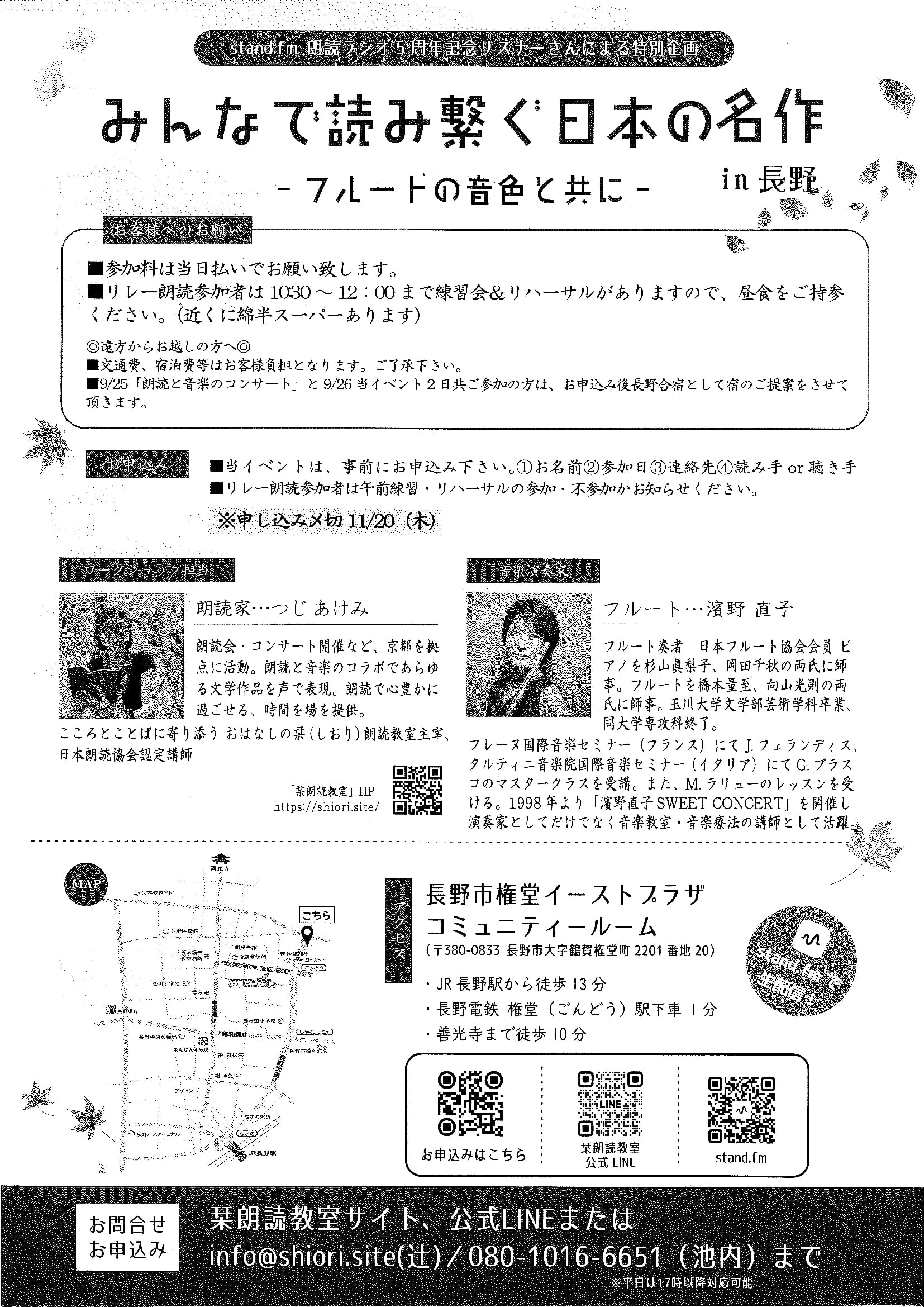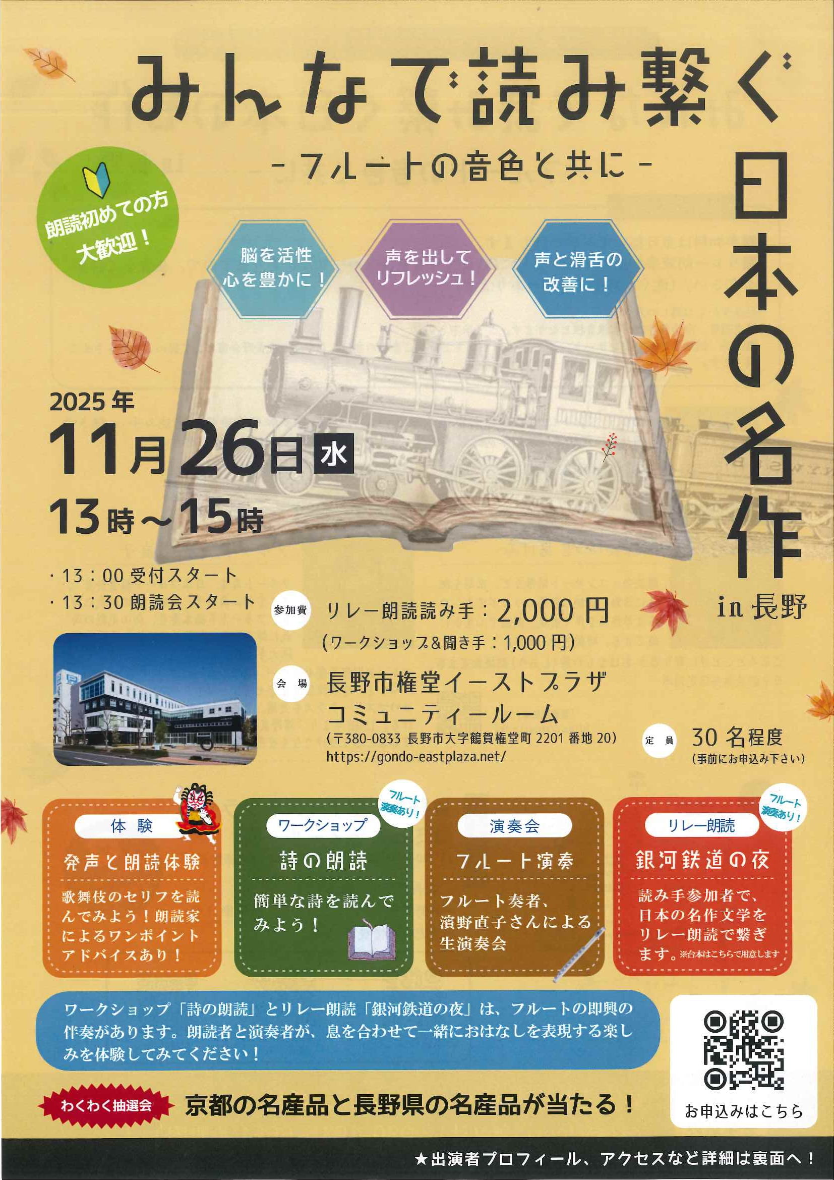 講座・イベント みんなで読み繋ぐ日本の名作in長野 ーフルートの音色と共にー 更新日:2025.09.24 日にち2025年11月26日(水) 時間13:00~15:00 場所コミュニティルーム1・2 内容詳細は主催者様へお問い合わせください。