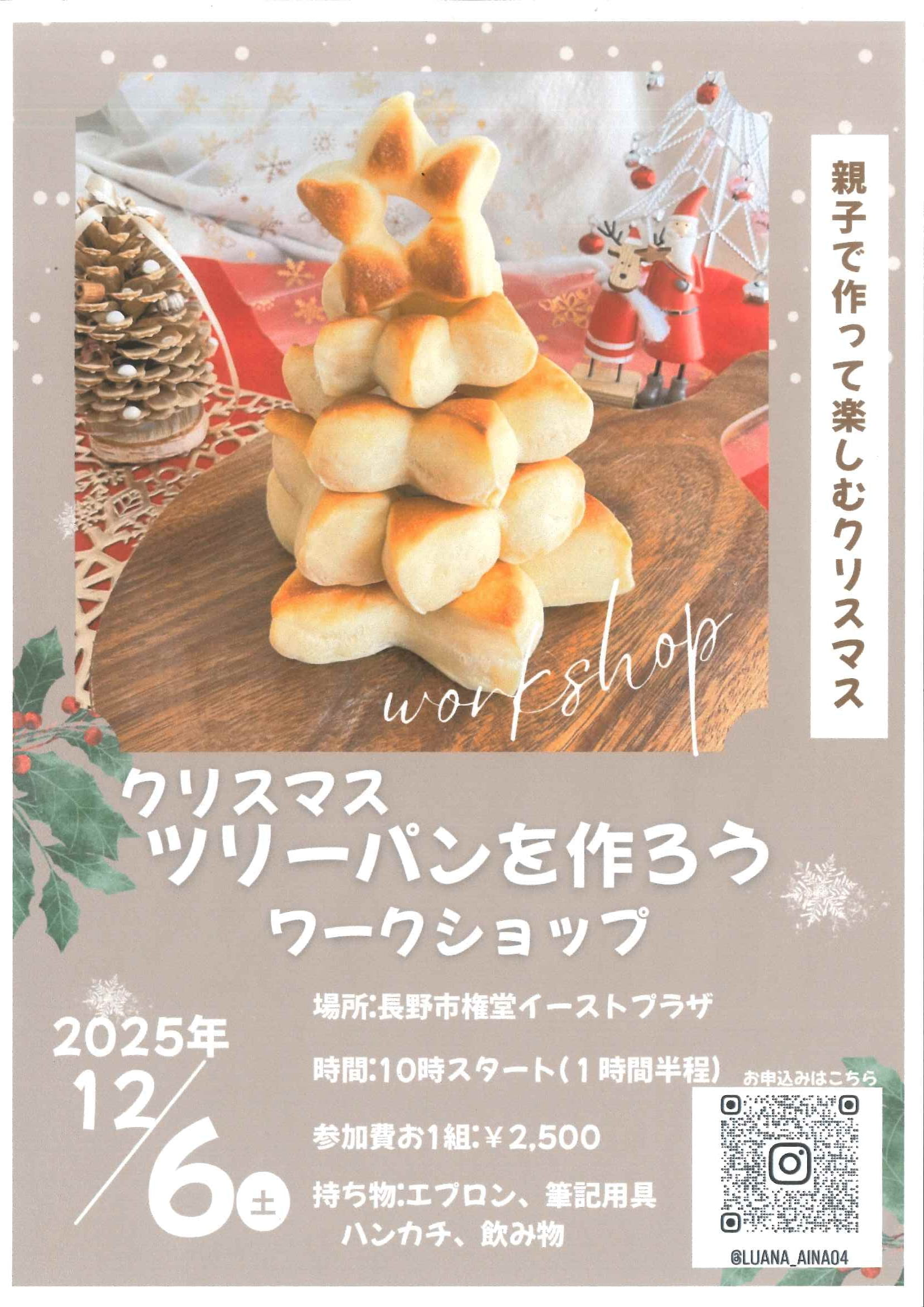講座・イベント パン教室ルアナアイナ 「クリスマスのパンをつくろう」 更新日:2025.10.01 日にち2025年12月06日(土) 時間10:00~12:00 場所コミュニティルーム1 予約方法主催者様(日々のパン教室 ルアナアイナ 様)へお問い合わせください 内容詳細は主催者、日々のパン教室ルアナアイナ様(@luana_aina04)へ、直接お問い合わせください。