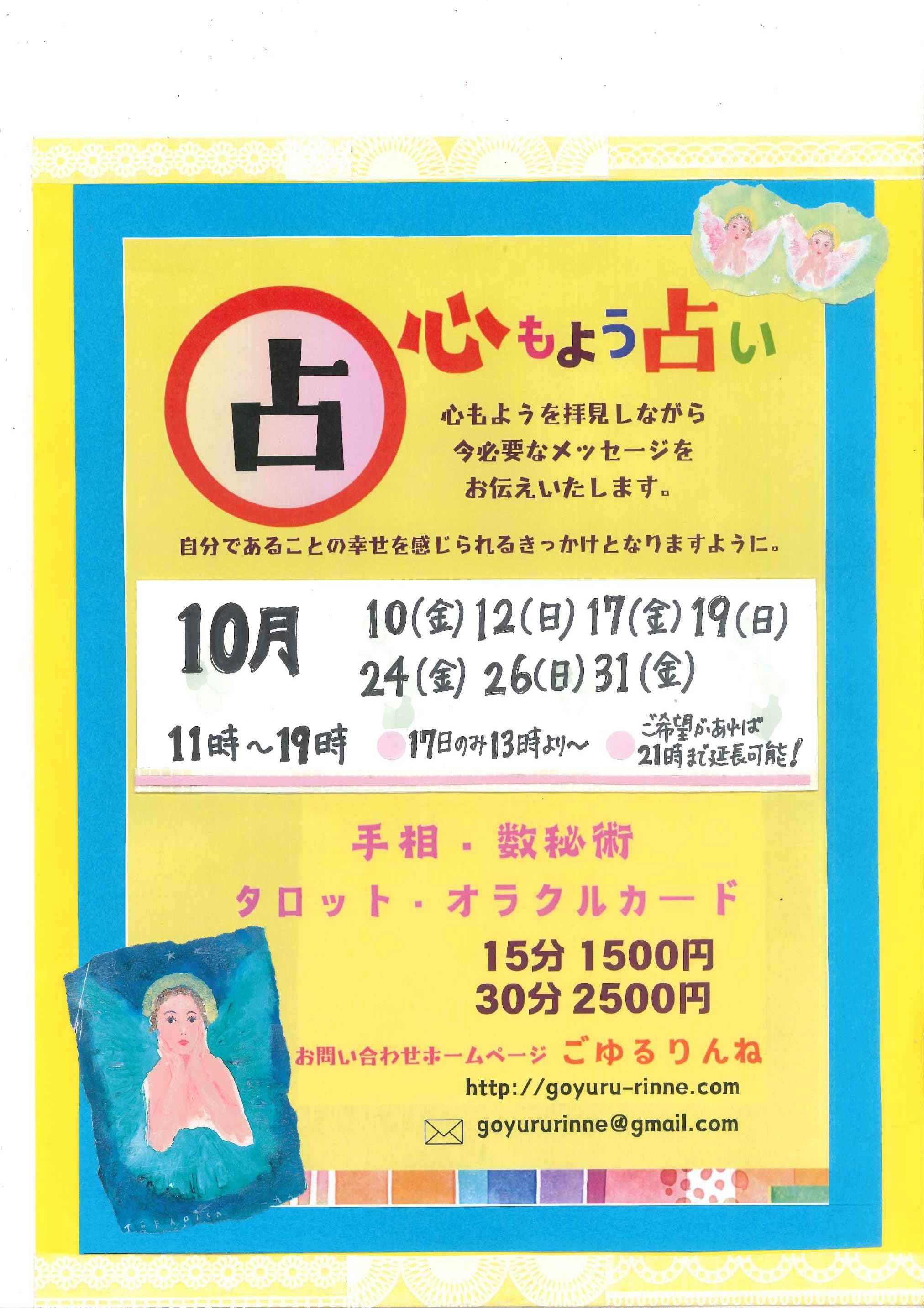 講座・イベント 占いカウンセリング ごゆるりんね 更新日:2025.10.08 日にち2025年10月10日(金)2025年10月12日(日)2025年10月17日(金)2025年10月19日(日)2025年10月24日(金)2025年10月26日(日)2025年10月31日(金) 時間11:00~19:00(17日のみ13:00~) 場所多目的スペース 参加費有料 内容詳細は主催者様へお問い合わせください。 ごゆるりんね(https://goyuru-rinne.com/)
