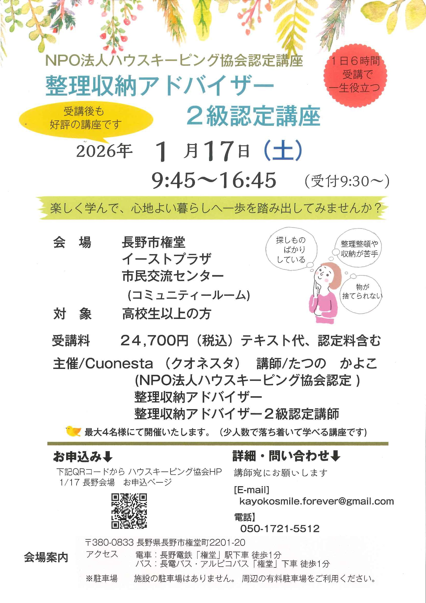 講座・イベント 整理収納アドバイザー2級認定講座 更新日:2025.10.08 日にち2026年01月17日(土) 時間9:45~16:45(受付9:30~) 場所コミュニティールーム2 参加費有料 予約方法詳細は主催者様へお問い合わせください。 内容お問合せ:050-1721-5512