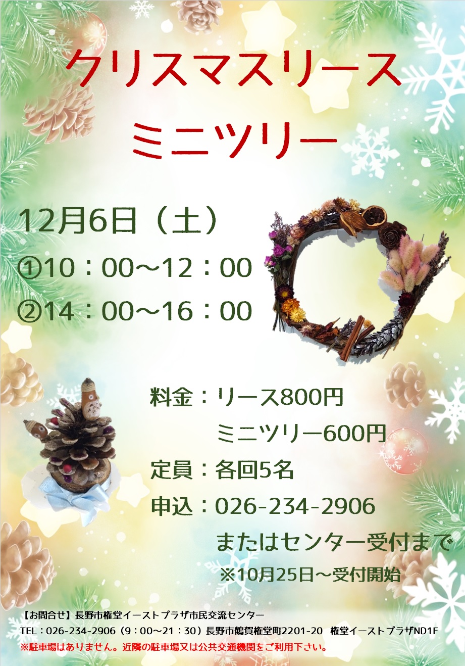 トピックス クリスマスリース・ミニツリー 更新日:2025.10.25 日にち2025年12月06日(土) 時間①10:00~12:00 ②14:00~16:00 場所多目的スペース 参加費リース 800円 / ミニツリー 600円 予約方法026-234-2906 または市民交流センター受付まで 定員各回5名 持ち物ビーズやリボンなど装飾したいものがある方はお持ちください 内容松ぼっくりや木のつるで、かわいいクリスマスのオーナメントを作っちゃおう♪