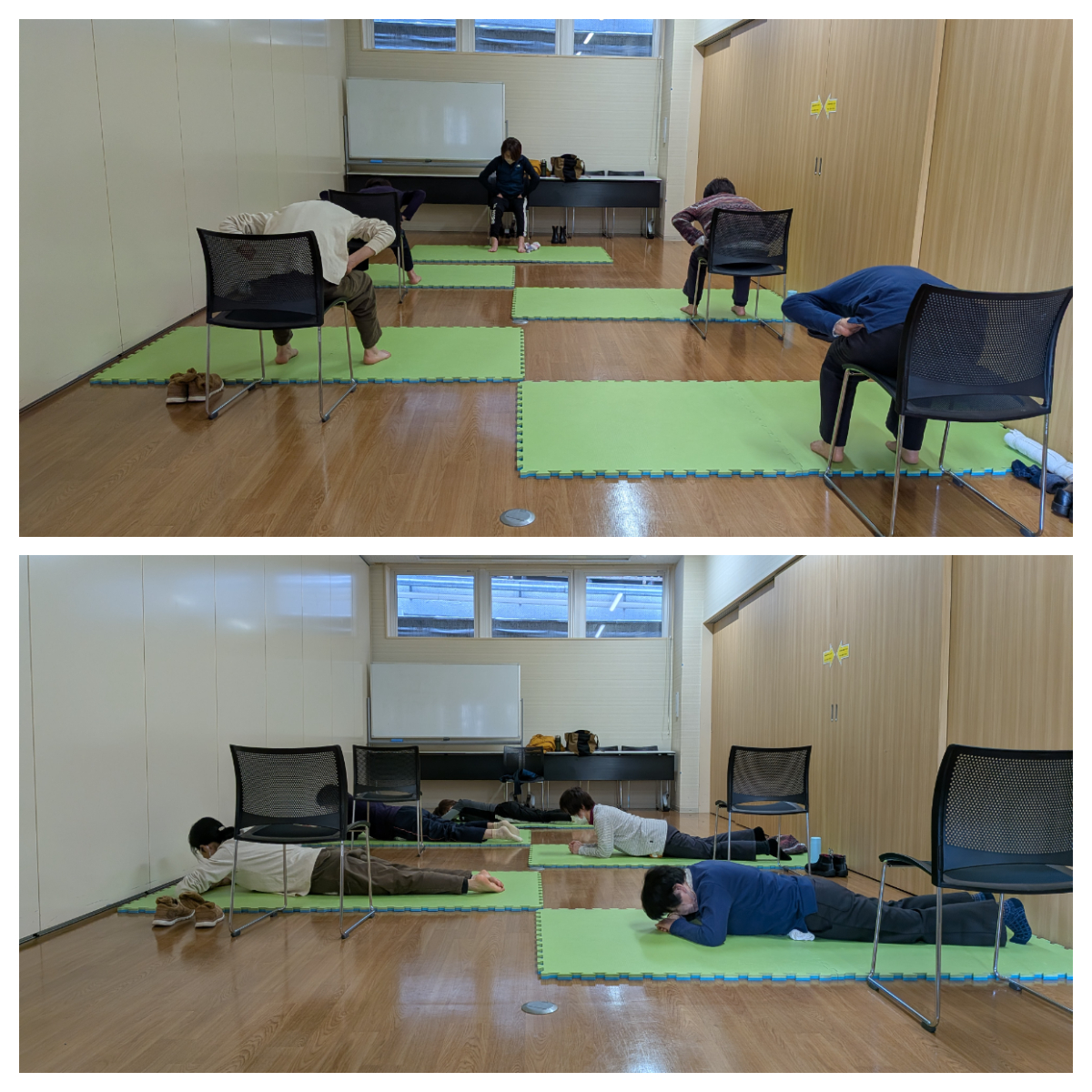 足の指を解し終えたあと、腸のトレーニングがスタートです。椅子に座り腸周りのストレッチ、マットに寝そべり棒状にしたタオルを使ったトレーニングを行いました。