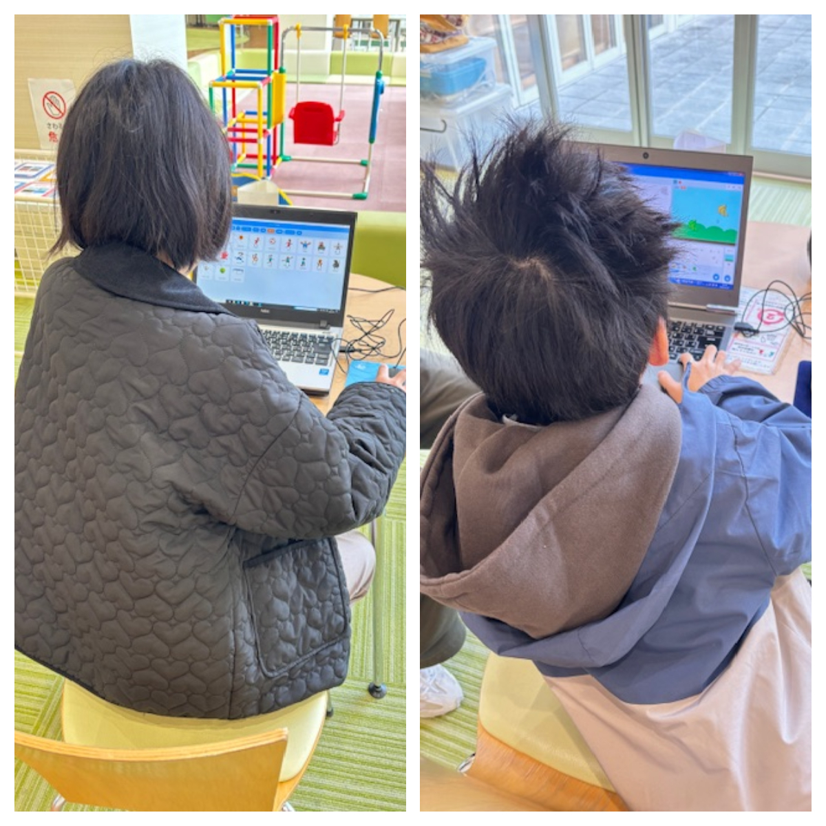 その中で、自分が想像した色になるように試行錯誤する様子や分からないところをスタッフと一緒に考えながら解決する様子が見られました。使用したいブロックをすぐに見つけており、スクラッチを始めた時より成長を感じる場面もありました。
