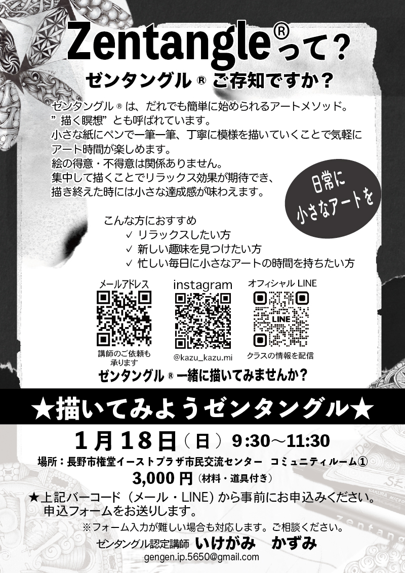 講座・イベント ゼンタングル講座 更新日:2025.11.23 日にち2026年01月18日(日) 時間9:30~11:30 場所コミュニティルーム1 予約方法主催者様へお問い合わせください 内容詳細は主催者様へお問い合わせください いけがみ かずみ(ゼンタングル認定講師) gengen.ip.5650@gmail.com