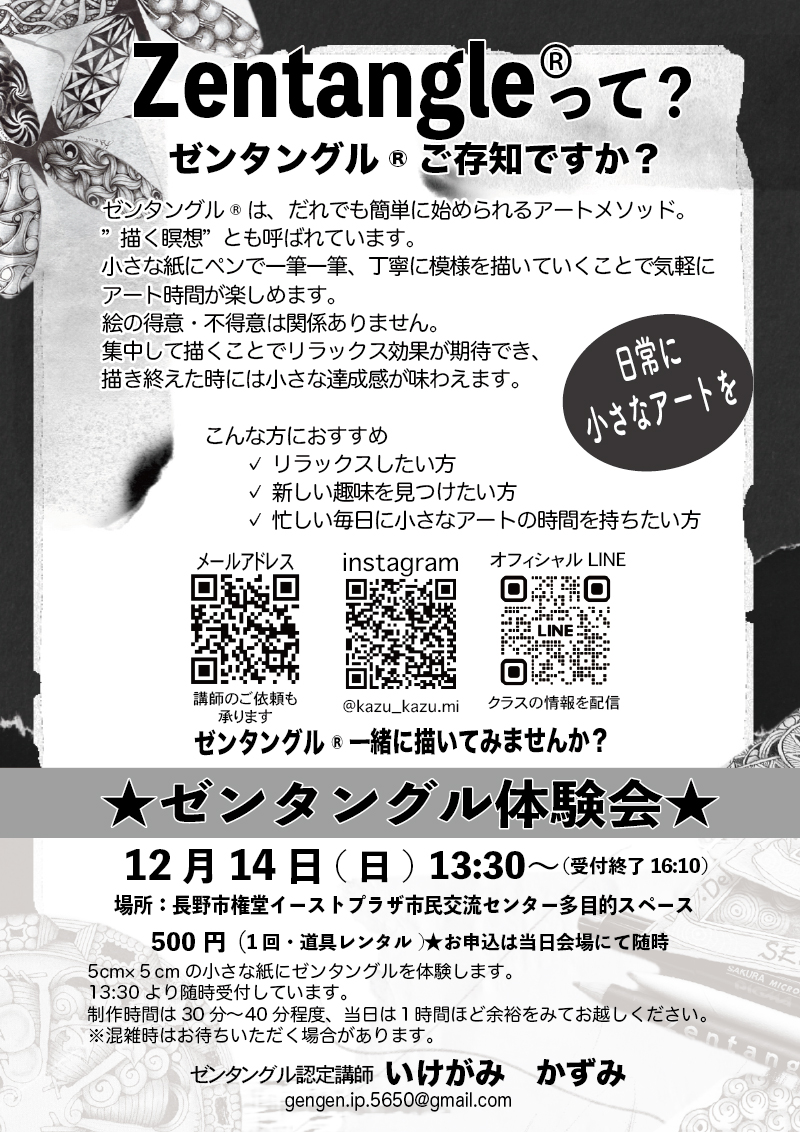 講座・イベント ゼンタングル体験会 更新日:2025.11.23 日にち2025年12月14日(日) 時間13:30~ (受付終了 16:20) 場所多目的スペース 予約方法主催者様へお問い合わせください 内容詳細は主催者様へお問い合わせください いけがみ かずみ(ゼンタングル認定講師) gengen.ip.5650@gmail.com