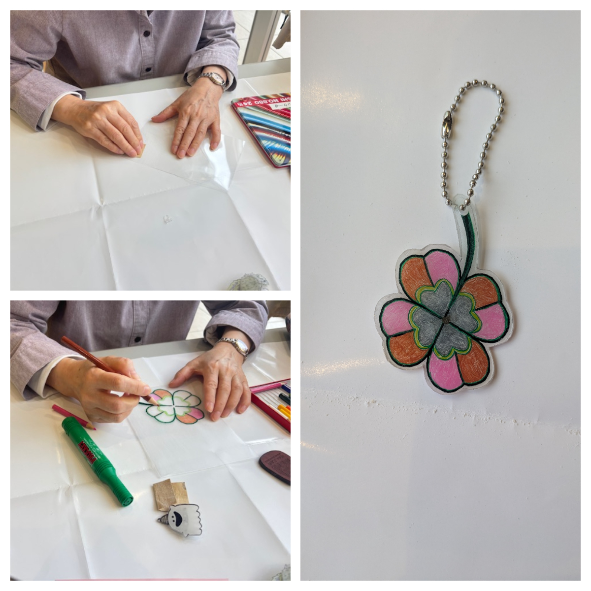下絵の中から四つ葉のクローバーのデザインを選び、プラバンに描いていく作業では「葉っぱの色を変えてみようかな」「この部分はこうしてみようかな」と楽しそうに取り組まれる姿が見られました。トースターで焼いたプラバンが小さくなる様子にも「こんなに小さくなっちゃうのね」と驚きの声が上がりました。