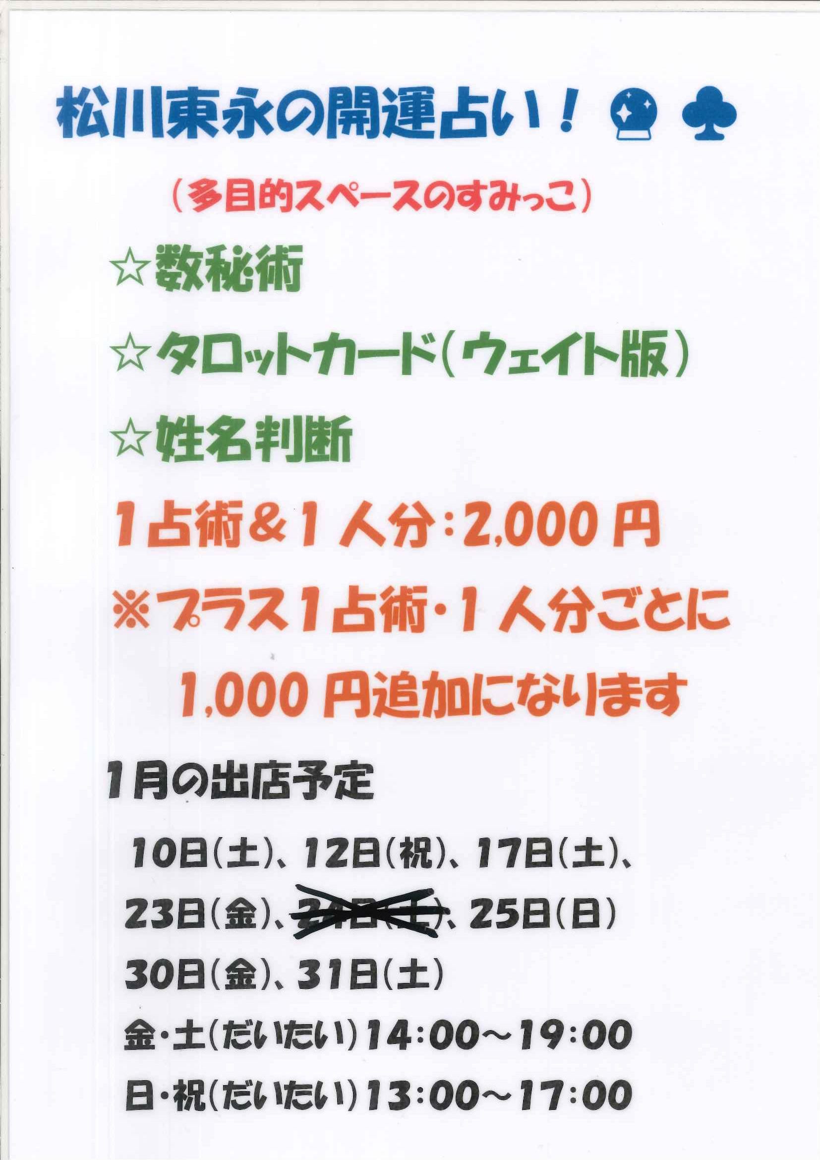 講座・イベント 松川東永の開運占い 更新日:2025.12.08 日にち2026年01月10日(土)2026年01月12日(月)2026年01月17日(土)2026年01月23日(金)2026年01月25日(日)2026年01月30日(金)2026年01月31日(土) 時間13:00~17:00(12.25日)13:00~19:00(10.17.31日)14:00~19:00(23.30日) 場所多目的スペース 参加費有料 内容詳細は主催者様にお問い合わせください 松川東永様(matsukawa.toei)