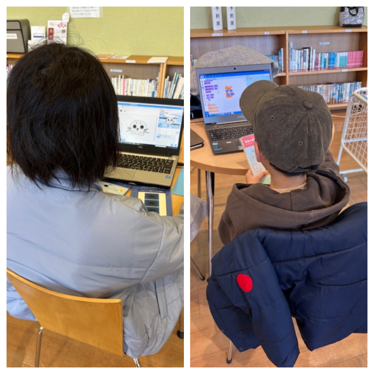 今回もお席にご案内するとすぐにパソコンに向かい、自分の思っていることを形にしようと制作をスタートしました。初めて挑戦するヒントカードを見つけて、キャラクターを動かしてポイントを獲得するゲームを作成したり、ヒントカードを見ながら、ボールの色や音を自分の好きなものに変更するなど、自分なりのアレンジを加えてピンポンゲームを作成したりする姿が印象的でした。