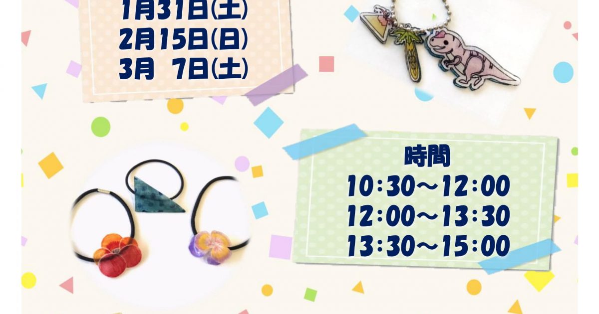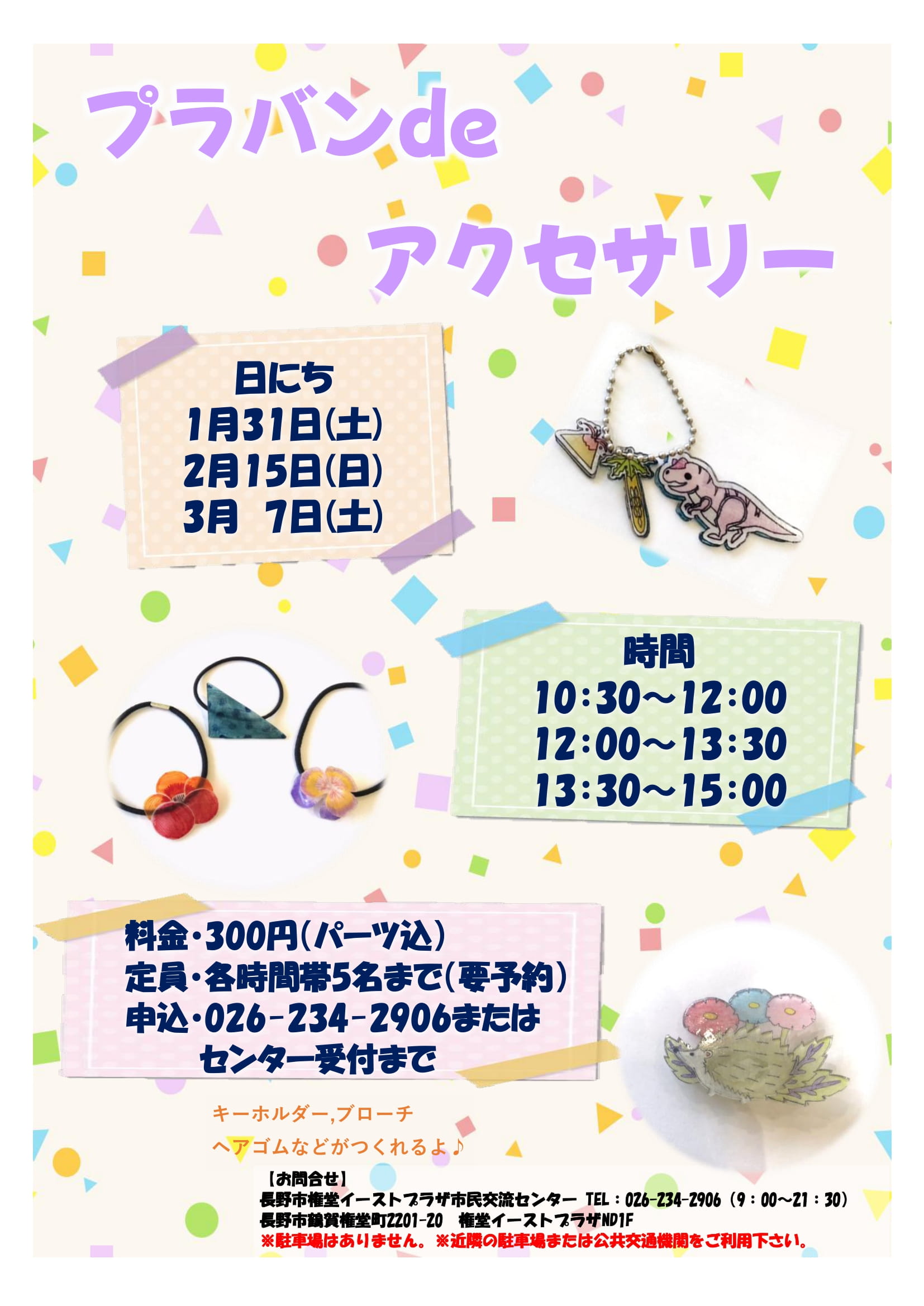 トピックス プラバン de アクセサリー(3/7) 更新日:2025.12.21 日にち2026年03月07日(土) 時間10:30~15:00 場所多目的スペース 参加費300円 予約方法026-234-2906または市民交流センター受付まで 定員1時間30分入れ替え制。各時間帯5名まで。 持ち物アクセサリーにつけたいパーツや色や柄の入った紙、糸、ビーズなどあればお持ちください。 内容プラバンで、オリジナルアクセサリーを作ります。 イヤリング、へアアクセサリー、リングなどが作れます!! 活動報告
