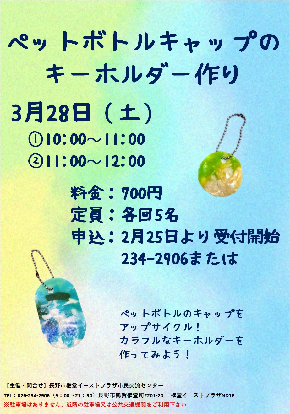 トピックス ペットボトルキャップのキーホルダー作り 更新日:2026.02.19 日にち2026年03月28日(土) 時間①10:00~11:00 ②11:00~12:00 場所多目的スペース 参加費700円 予約方法2月25日より受付開始。026-234-2906 または市民交流センター受付まで 定員各回5名 持ち物特になし 内容ペットボトルのキャップをアップサイクル! カラフルなキーホルダーを作ってみよう! ※アイロンを使いますので、必ず保護者の方の付き添いをお願い致します。