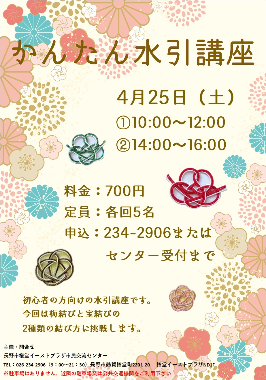 今回は梅結びと宝結びの2種類の結び方に挑戦します。