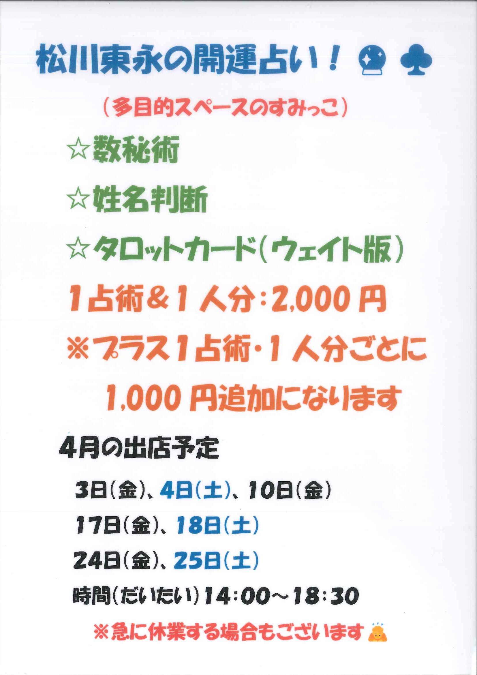 講座・イベント 松川東永の開運命名占い 更新日:2026.03.20 日にち2026年04月18日(土) 時間14:00~19:00 場所多目的スペース 参加費有料 内容詳細は主催者様にお問い合わせください 松川東永様(matsukawa.toei)