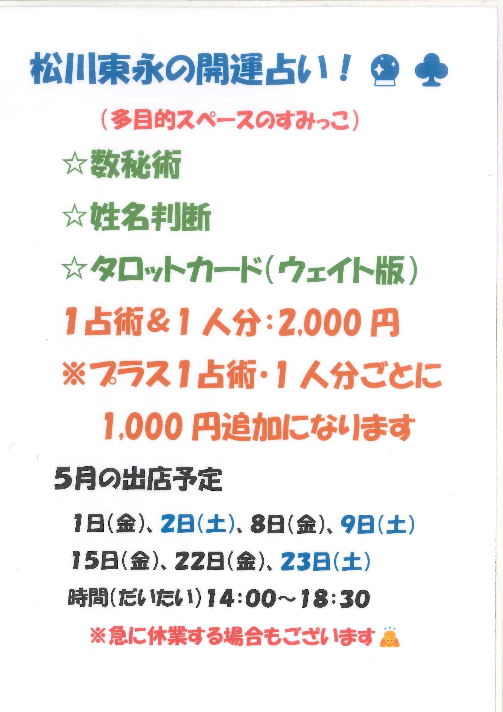 講座・イベント 松川東永の開運命名占い 更新日:2026.04.05 日にち2026年05月01日(金)2026年05月02日(土)2026年05月08日(金)2026年05月09日(土)2026年05月15日(金)2026年05月22日(金)2026年05月23日(土) 時間14:00~19:00 場所多目的スペース 参加費有料 内容詳細は主催者様にお問い合わせください 松川東永様(matsukawa.toei)