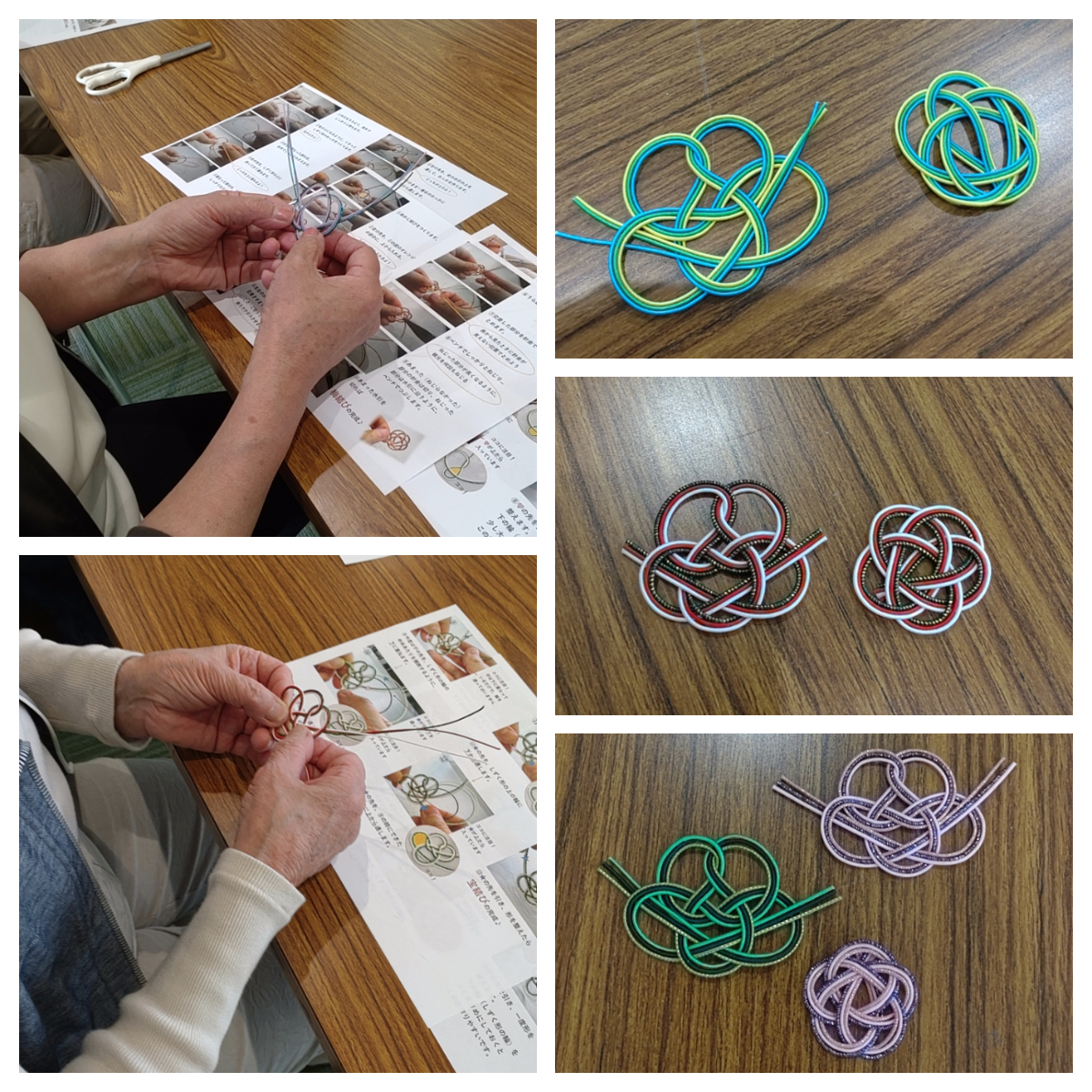 初めてのご参加の方はスタッフの説明を聞きつつ、手順書も参考にあわじ結びから製作にチャレンジ。「これは?こっちは?」とスタッフに質問しながら皆さま熱心に取り組んでおられました。