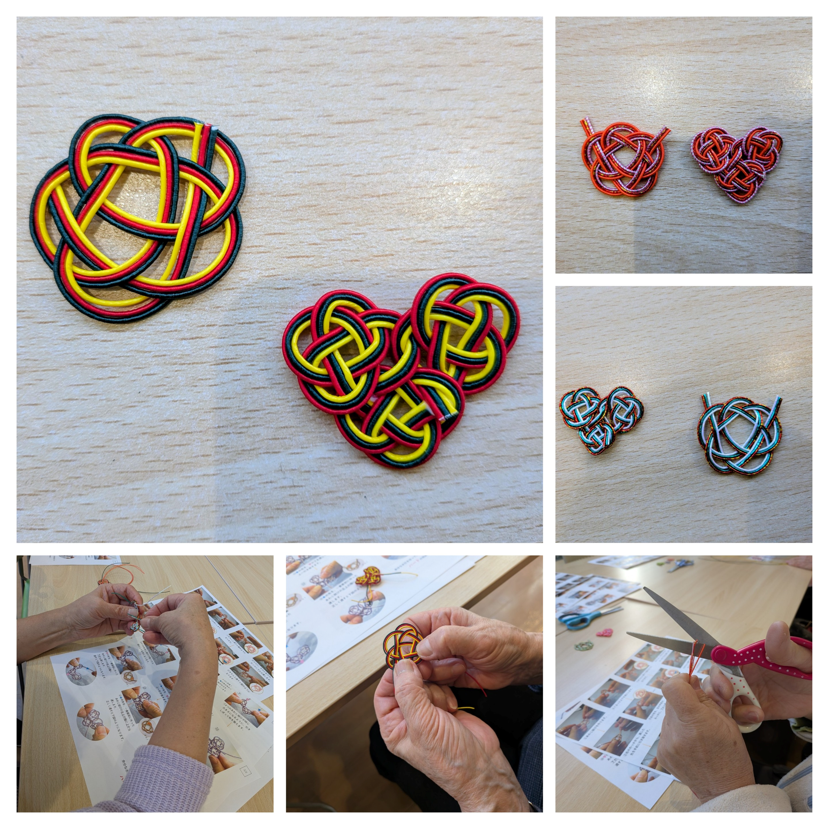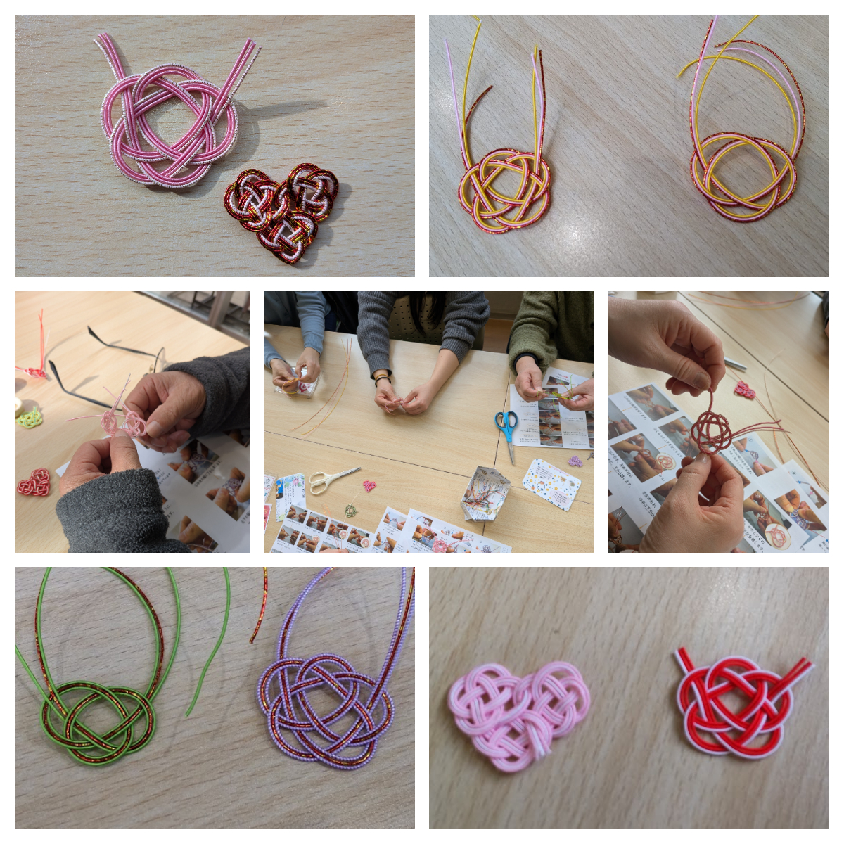 リピーターの方と、初めて参加される方が半々くらいでしたので、できる方は自分のペースで椿結びやハートに取り掛かってもらい、初めての方や久しぶりで復習をしたい方はスタッフと一緒にあわじ結びを結ぶ所からスタートしました。