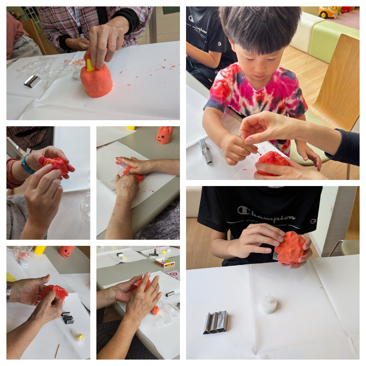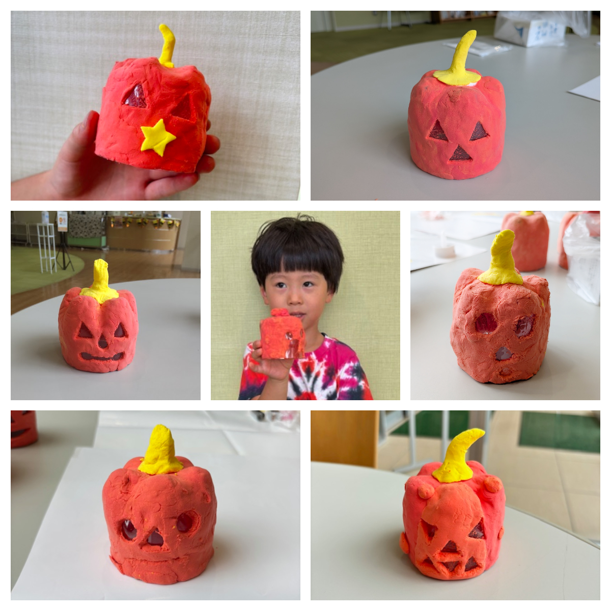 材料と作り方を簡単に説明したあと、作業に取り組んでもらいました。今回使う紙粘土は黄色と赤色の2色です。先ずはかぼちゃのヘタになるパーツの粘土を決めてもらい、残った2色の紙粘土を捏ねて混ぜ合わせ、かぼちゃ本体になるオレンジ色を作っていきます。